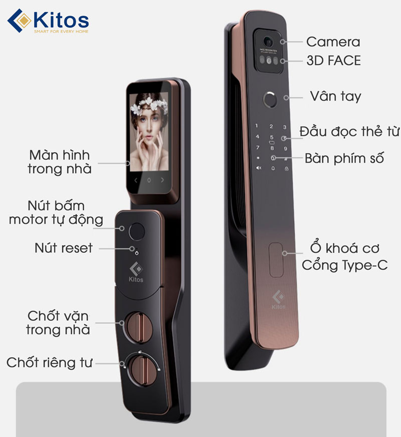 Tính năng: Nhận diện khuôn mặt, Chuông cửa camera vân tay , Mã số, Thẻ từ, Chìa cơ