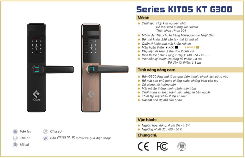 Khi lựa chọn Kitos G300 người dùng có thể sử dụng một trong các phương thức sau để mở khóa: Vân tay, mã số, thẻ từ, chìa cơ. Ngoài ra, khóa còn có lựa chọn mở rộng thêm module wifi – Kết nối và mở khóa từ xa qua điện thoại thông minh (Mua thêm).